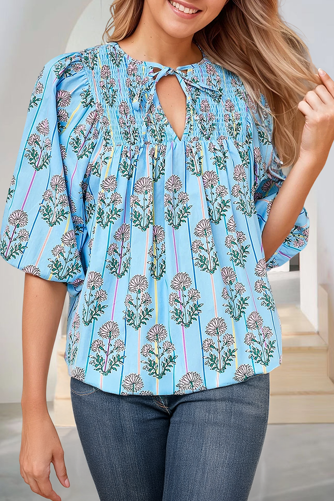 66DISCO - Floral Striped Print Tie Shirred Splie Neck Blouse (S-XL): Blue / Missy / L