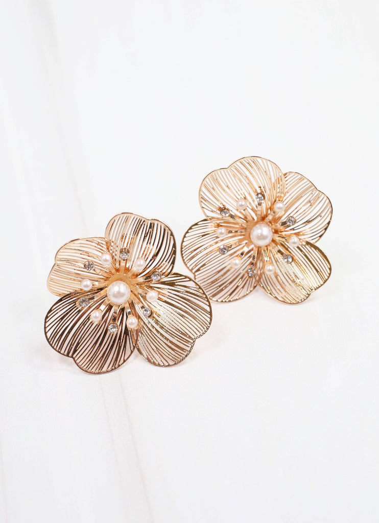 This intricate flower earring has thin cutouts and is embellished with pearls and CZs in the middle.