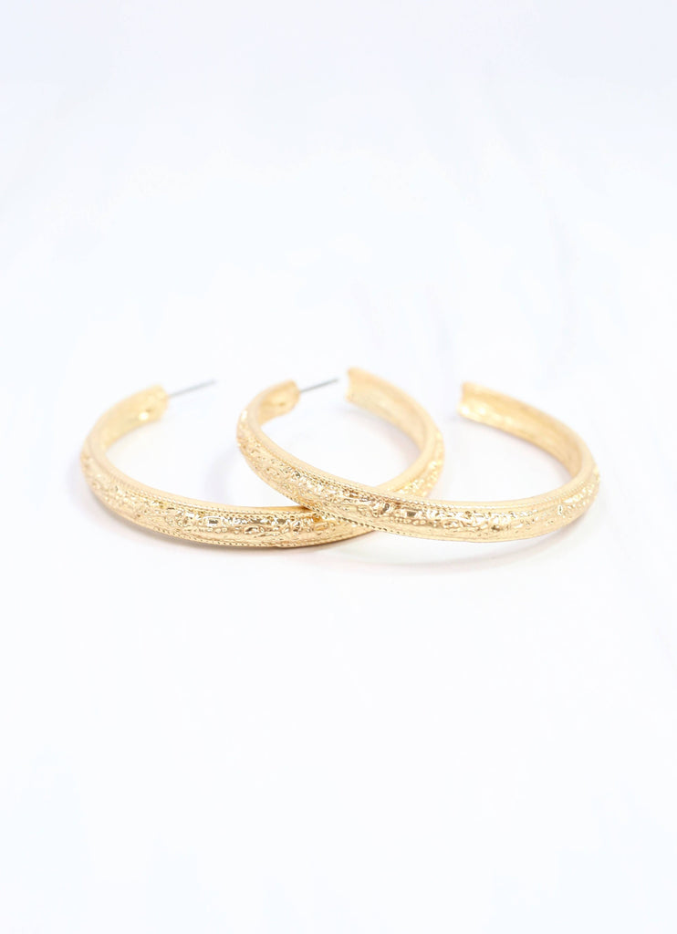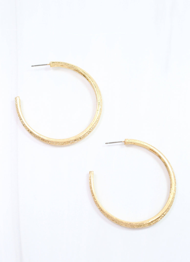 This hoop earring has a textured design with a vintage gold finish on a post back.