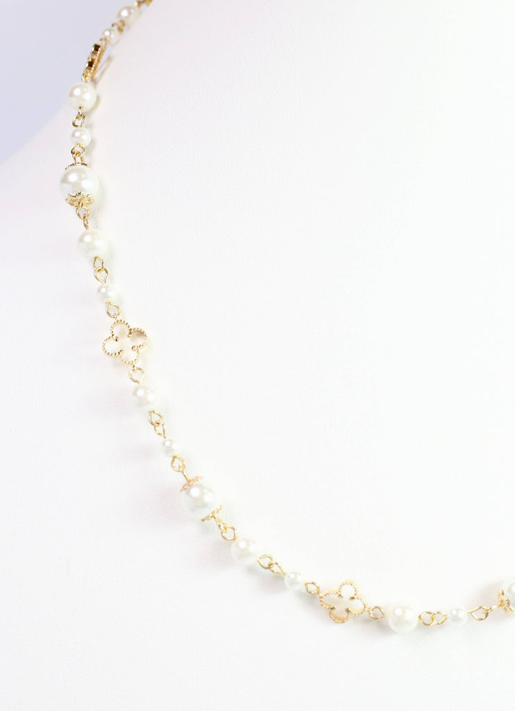 This elegant necklace is lined with different sized pearls and cutout clover accents. It has a classy design that can be worn casually or elegantly.