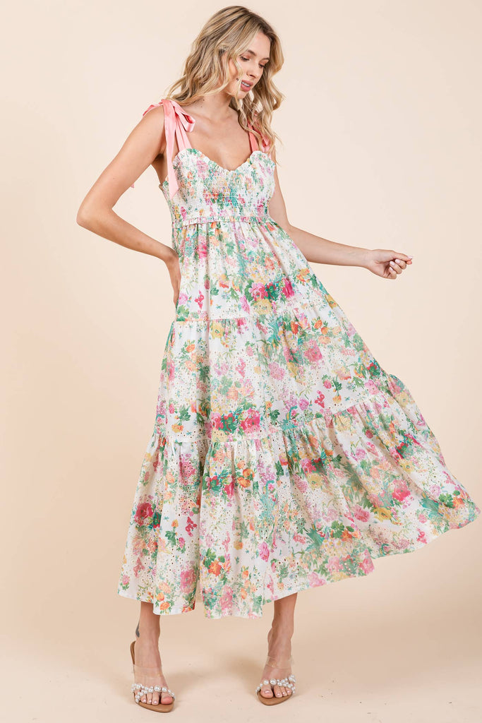 regular size, standard, young contemporary, contemporary, eyelet, floral print, sundress, midi dress, casual dress, embroidered, embroidery, self-tie shoulder strap, bow, ribbon, sleeveless, smocked top, smocking, sweetheart neck, tiered, side pockets, lining, lined, trendy, cute, lovely, stylish, fashionable, daily wear, everyday wear, holiday, Easter, Spring, Summer, SS, women's clothing, women's apparel, women's wear