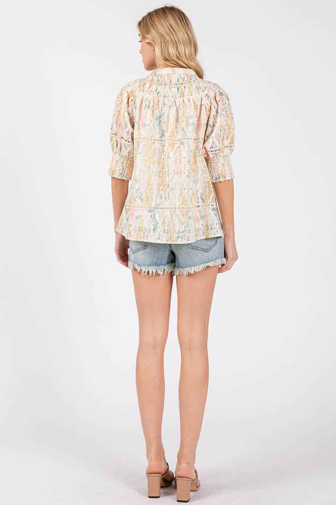 Natural print eyelet laced smocking detailed short sleeve blouse with lining inside along the bodyline.
