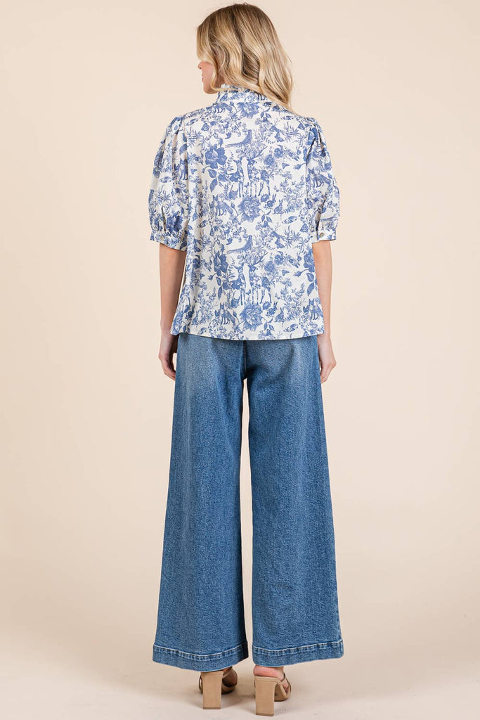 GeeGee Clothing - Nature Half Button-Up Blouse, MT51612: Cream/Blue / L