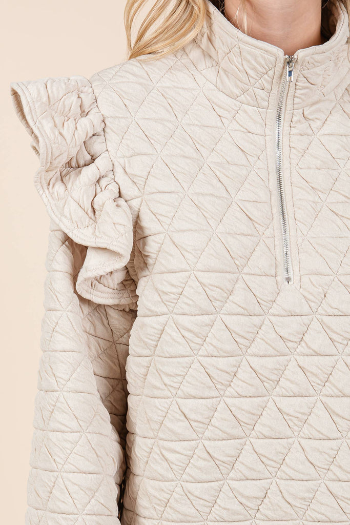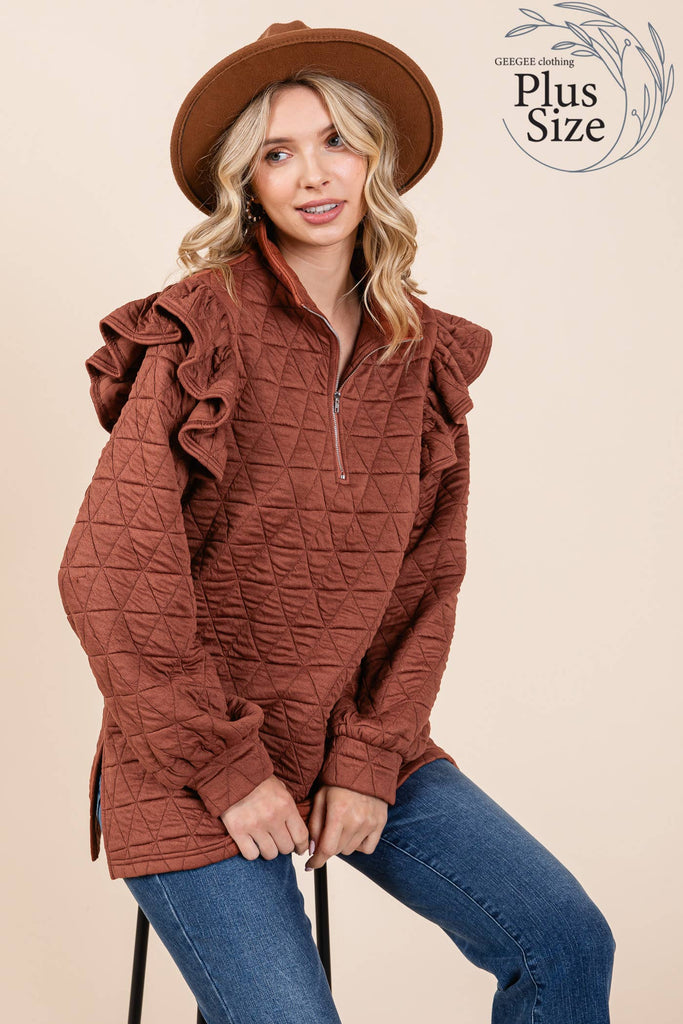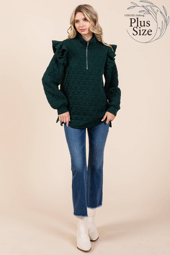 Plus size quilted half-zip pullover top with long sleeves, ruffle trim on the shoulder, and side slits.