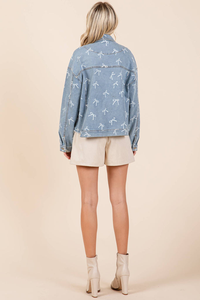 GeeGee Clothing - Plus Ribbon Print Denim Jacket, OJ50833PL: Denim / 1XL