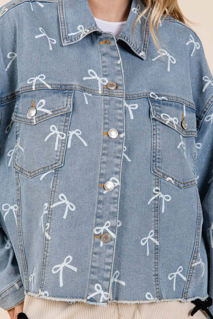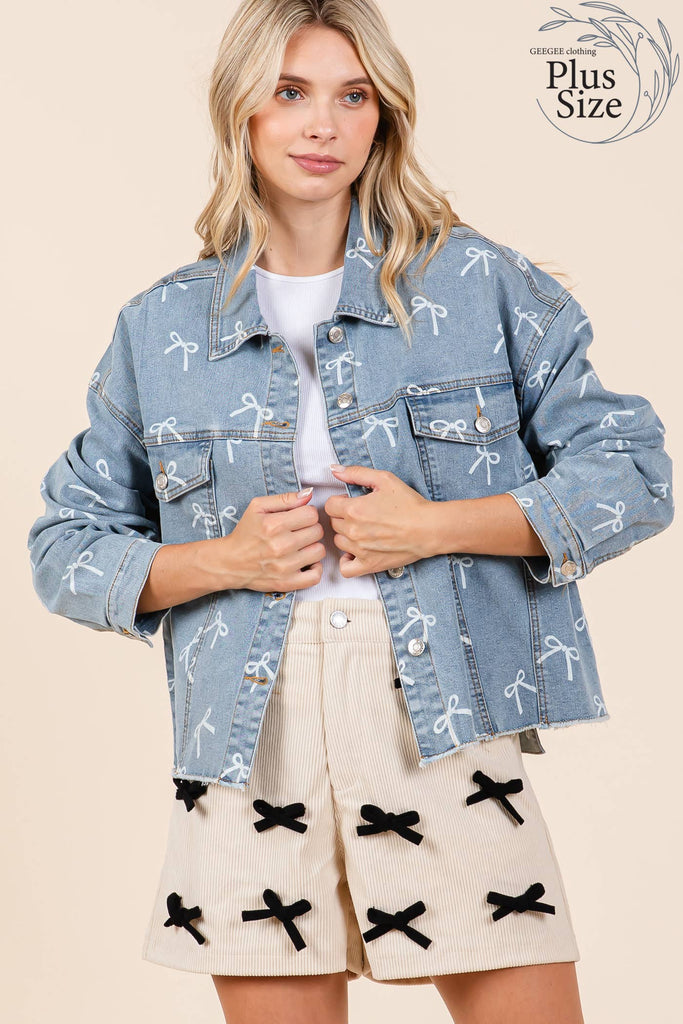 Plus size ribbon bow print oversized denim jacket. Features: plus size, curvy, ribbon, bow, denim, jacket, shacket, oversized, drop shoulder, button-up, collar neck, long sleeve, hi-lo, high-low, raw edge hem at the bottom, chest flap pockets, stylish, fashionable, chic, trendy, cute, boho, bohemian, comfortable, daily wear, transitional, fall, winter, spring, summer, fw, ss, women's clothing, women's apparel, women's wear
