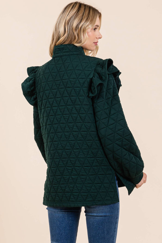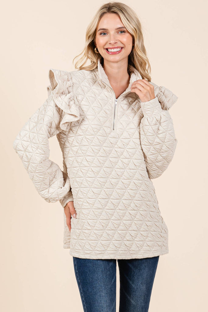 Quilted half-zip pullover top with long sleeves, ruffle trim on the shoulder, and side slits. regular size, standard, quilted, pullover, top, sweater, half-zip, zip neck, long sleeve, ruffle, slit, warm, comfortable, daily wear, outerwear