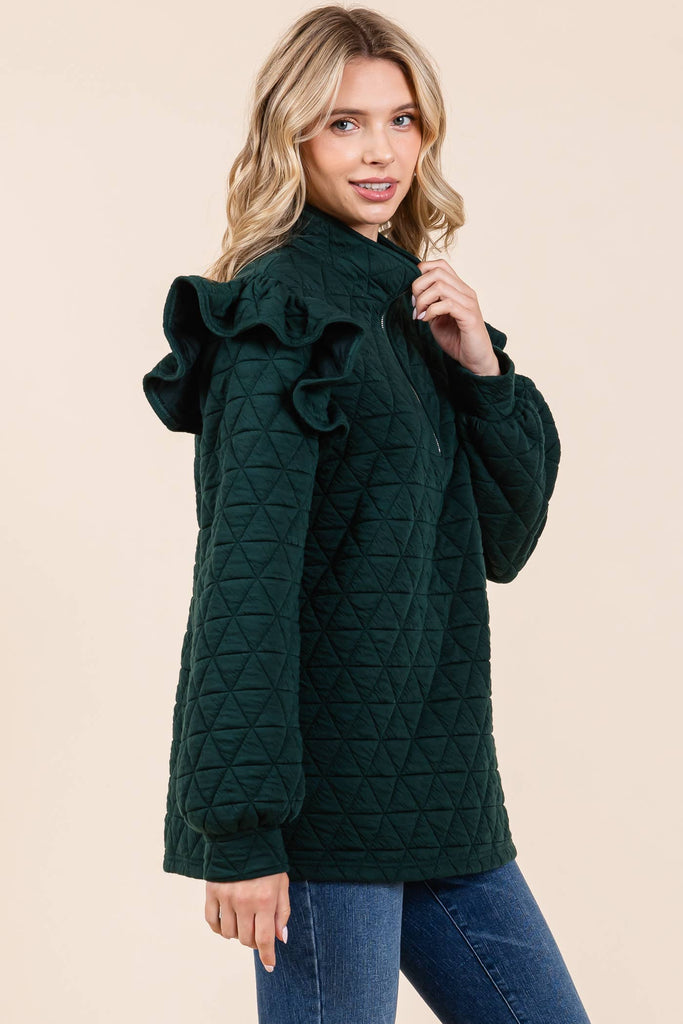 Quilted half-zip pullover top with long sleeves, ruffle trim on the shoulder, and side slits.