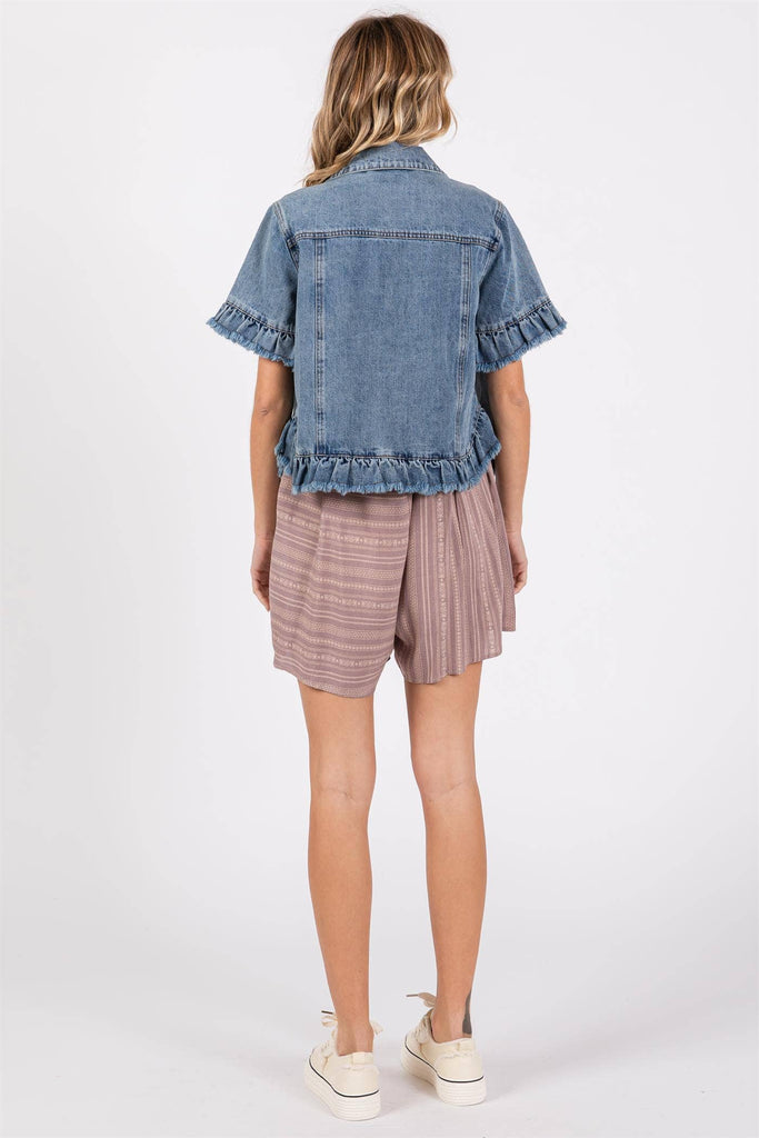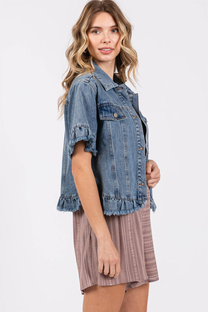 regular size, standard, young contemporary, contemporary, denim, jacket, outerwear, casual jacket, collar neck, button-up, short sleeves, ruffled trim, raw edge details, non-functional flap pocket detail, cute, stylish, fashionable, trendy, comfortable, daily wear, everyday wear, transitional, fall, winter, spring, summer, fw, ss, women's clothing, women's apparel, women's wear