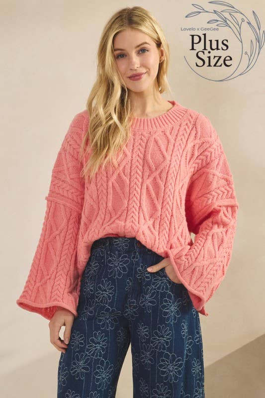 Plus size oversized cable knit pullover sweater top with raw trim and drop shoulders.