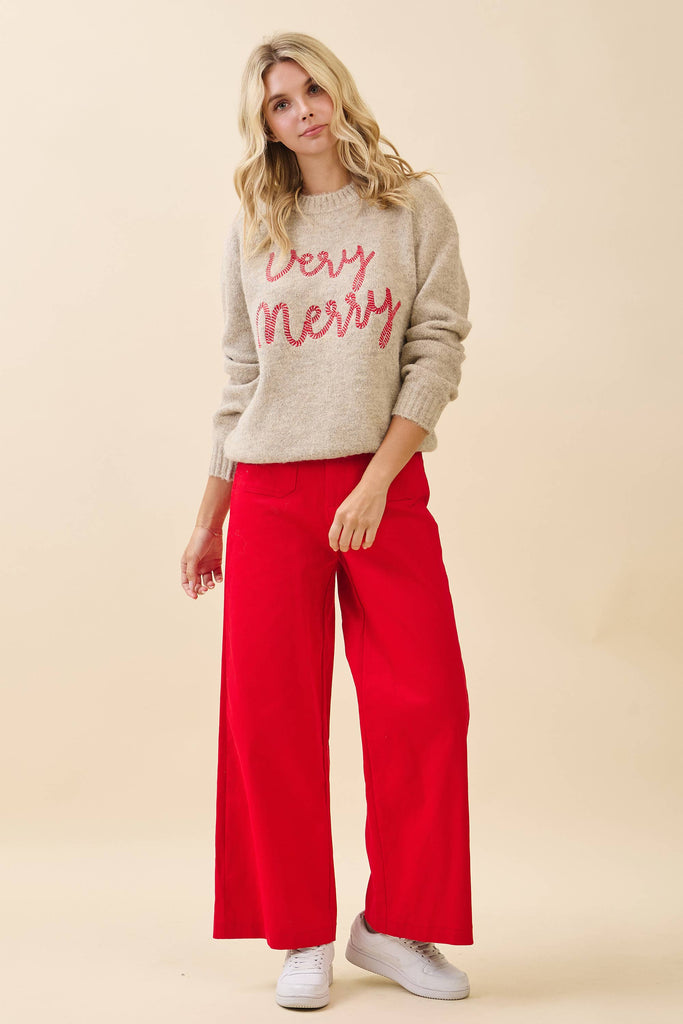Soft knit sweater features red embroidered "Very Merry" lettering, drop shoulders, and ribbed knit hems.