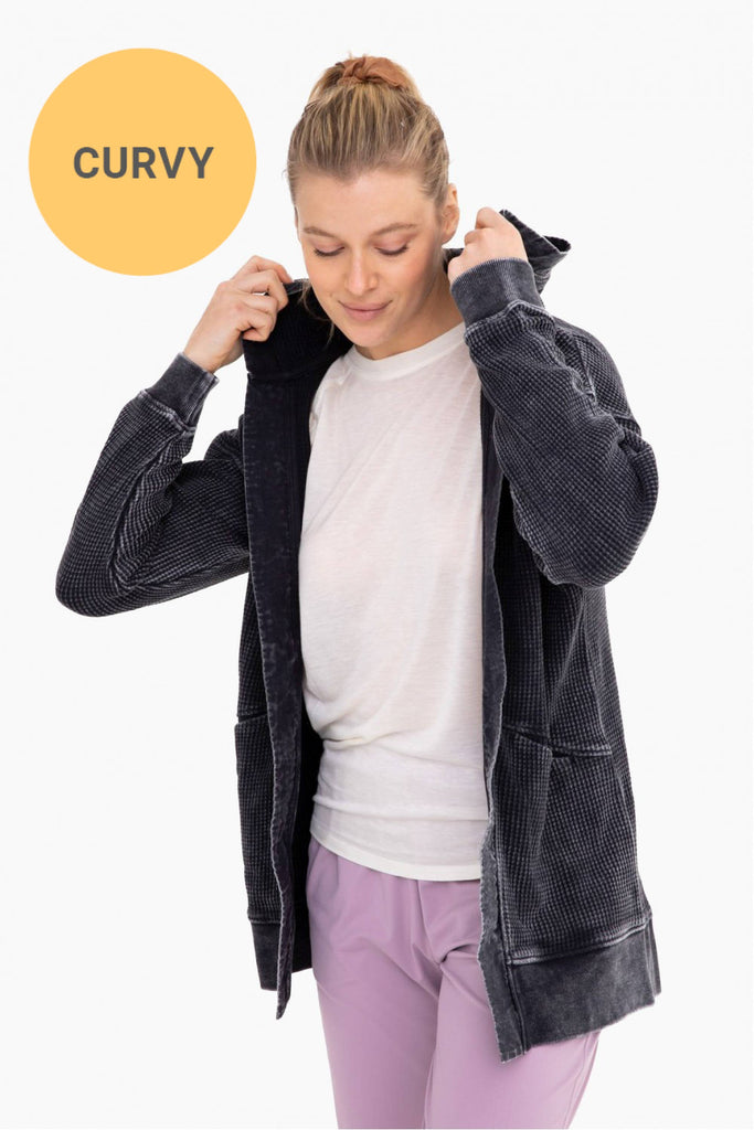 Mono B - CURVY Waffle Knit Mineral-Washed Cardigan: BLACK / 1XL:2XL:3XL (2:2:2)