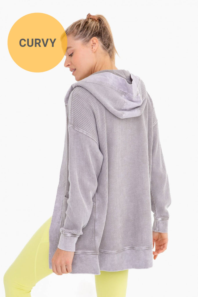 Look cool and feel cozy! This mineral-washed cardigan features a waffle knit design, side pockets, a hood, and drop sleeves for relaxed fit. 100% cotton Mineral-washed Made in China