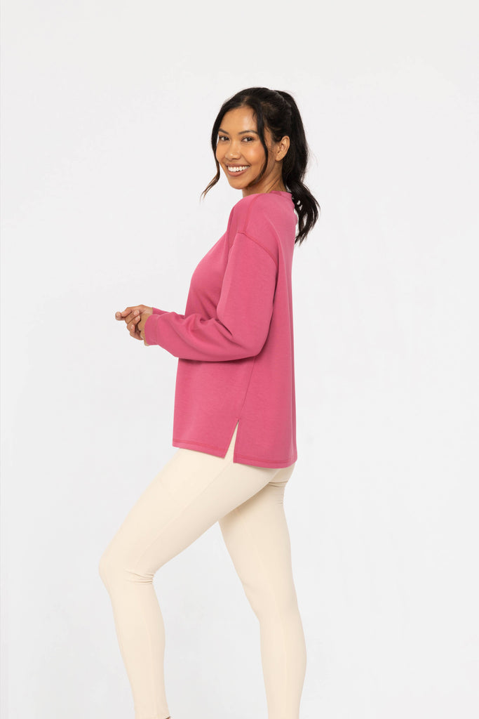 Elevate your wardrobe in this long line oversized tunic crew neck. Constructed from the Mono B best selling scuba fabric, this pullover top features a timeless silhouette, vents at the hem, and contrast stitching. Ericka, is 5'8", a size 4, and is wearing an S 50% rayon 45% polyester 5% spandex Four-way stretch Made in China