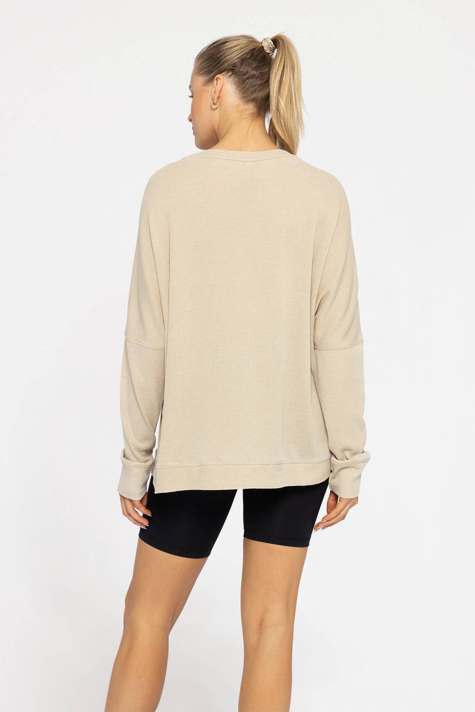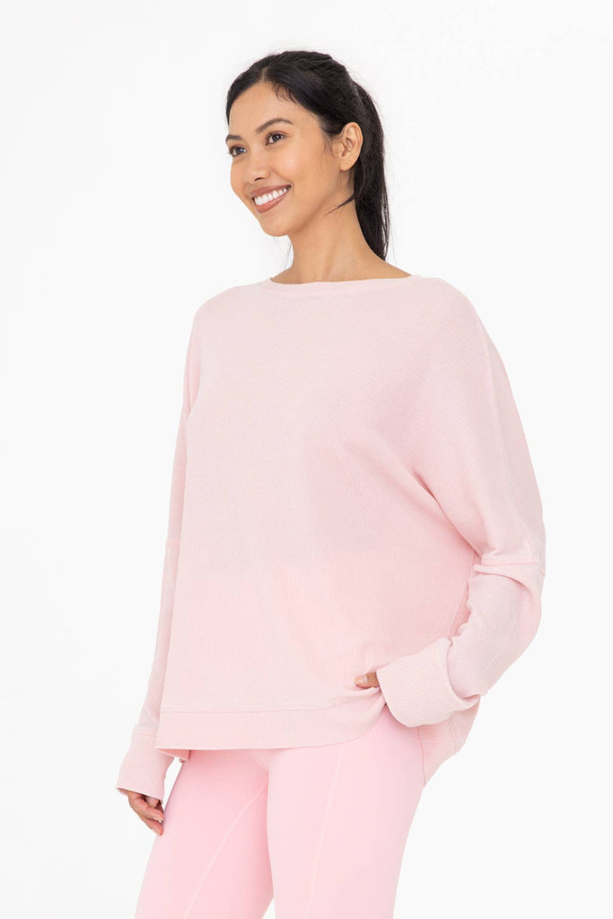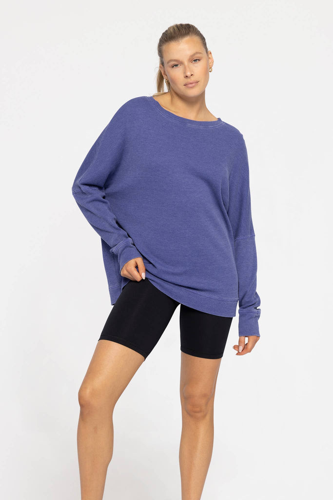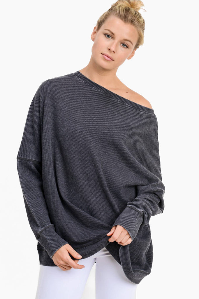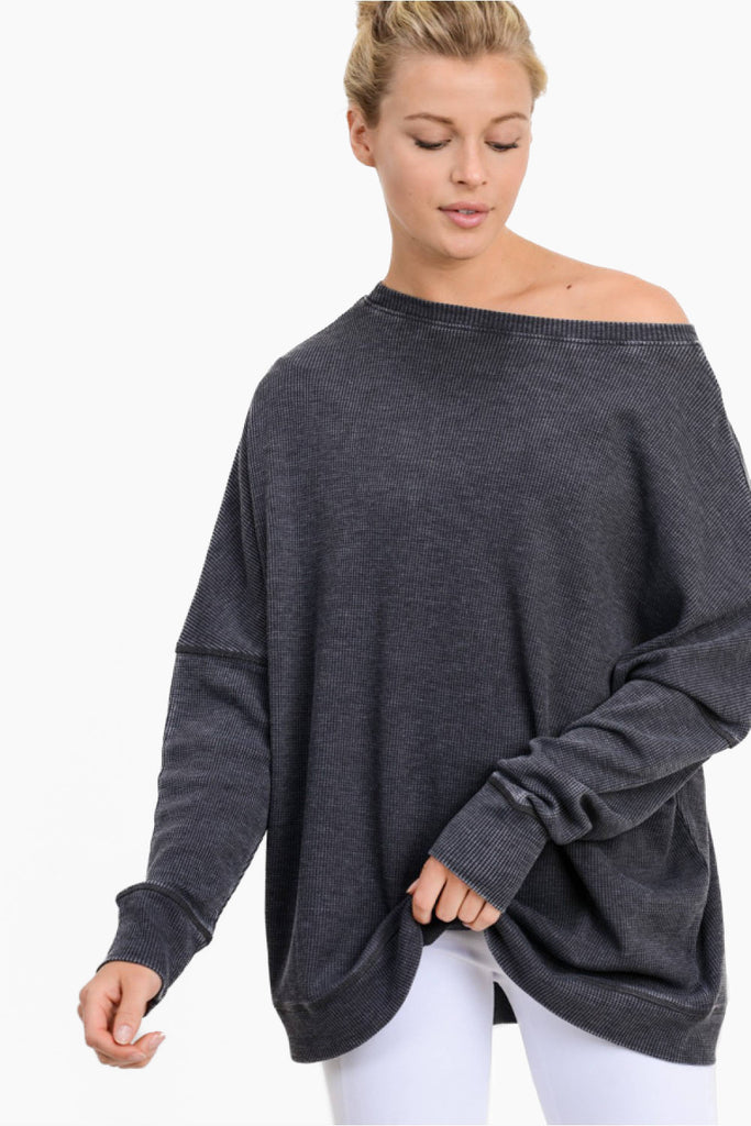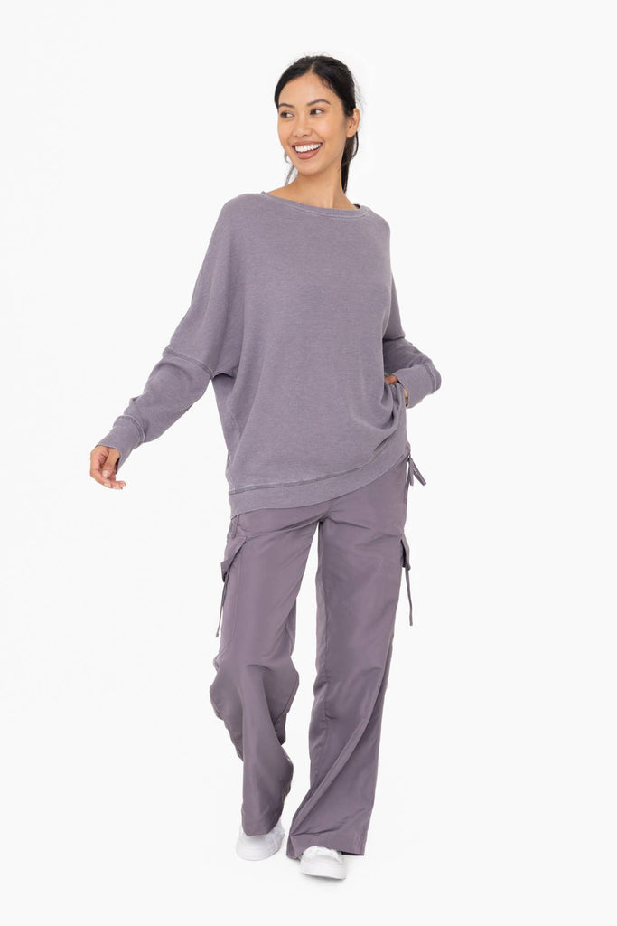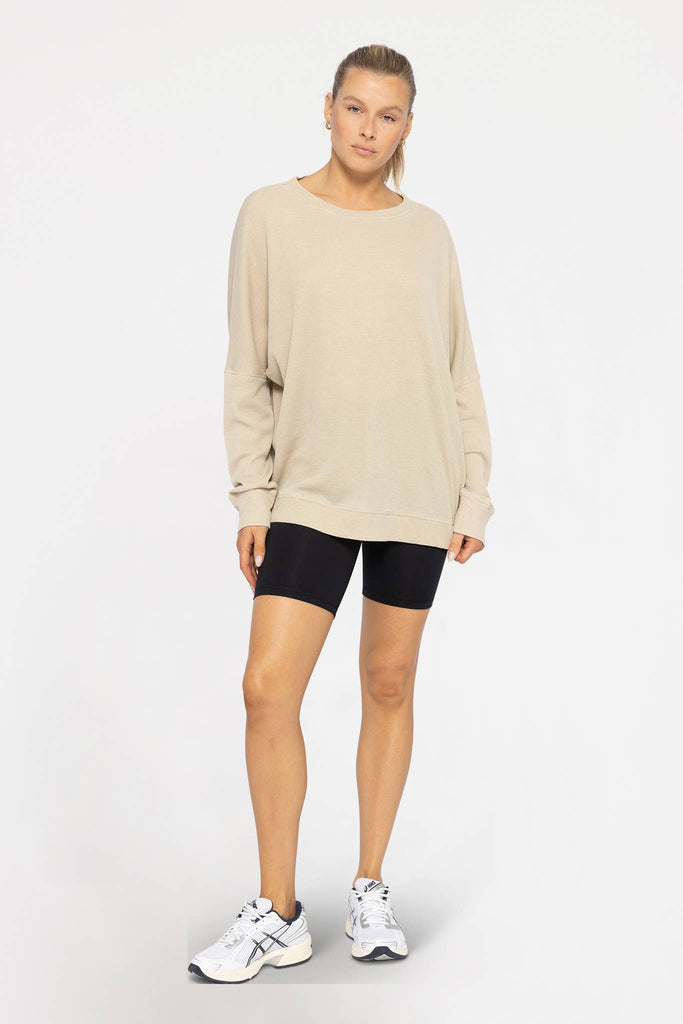 This slouchy pullover exudes casual vibes, and it is super versatile. It features rounded neck and long sleeves (with seams wrapping around the elbow). One size. Our model typically wears sample size S. 60% cotton, 40% polyester. Mineral wash. Made in China.