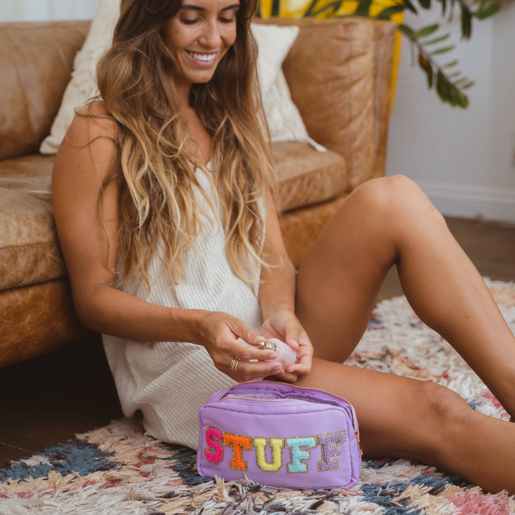 * Travel sized chenille letter patch bag * UNIT= PC * Made with water-repelling white nylon twill fabric * Rainbow chenille varsity letter patches that are sewn onto the bag * Gold metal zipper * Size - 9" x 5" x 2" * Style - Purple STUFF * Use as a travel carry on bag, purse organizer, makeup pouch, pencil pouch, toiletry bag, skin care cosmetic bag, and more Perfect for teen and women's boutiques, clothing stores, and resort gift shops. Custom letter pouches available - MOQ 100 units. Please message us for details.