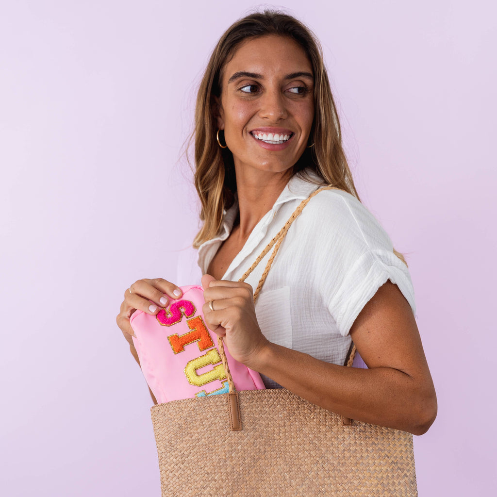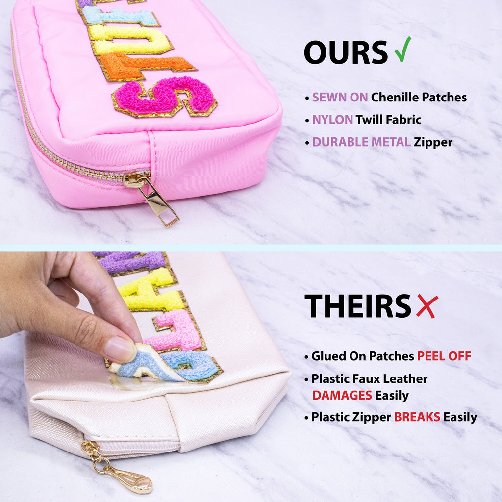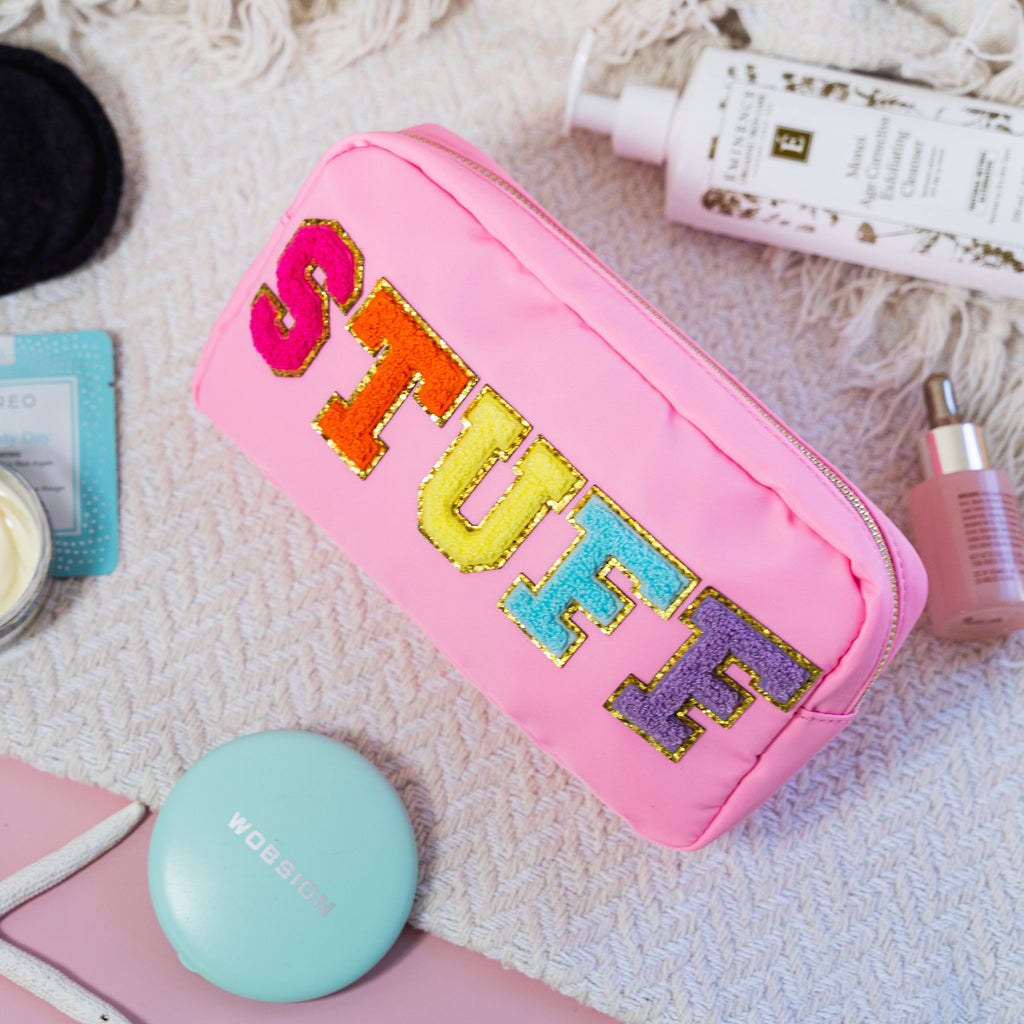 * Travel sized chenille letter patch bag * UNIT= PC * Made with pink water-repelling pink nylon twill fabric * Rainbow chenille varsity letter patches that are sewn onto the bag * Gold metal zipper * Size - 9" x 5" x 2" * Style - Pink STUFF * Use as a travel carry on bag, purse organizer, makeup pouch, pencil pouch, toiletry bag, skin care cosmetic bag, and more Perfect for teen and women's fashion boutiques, clothing stores, and resort gift shops. Custom letter pouches available - MOQ 100 units. Please message us for details.