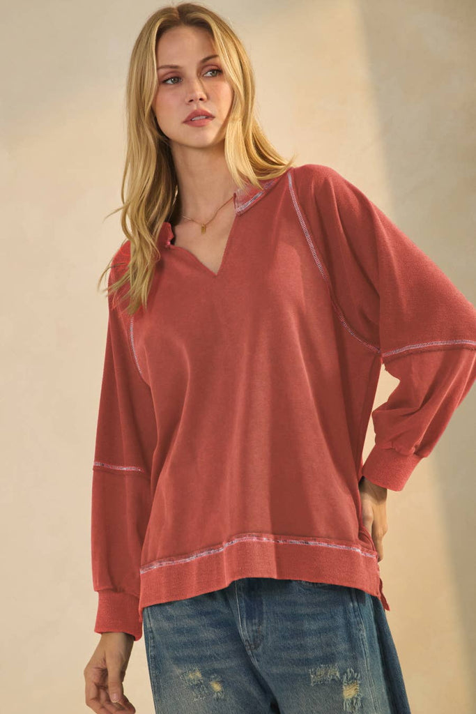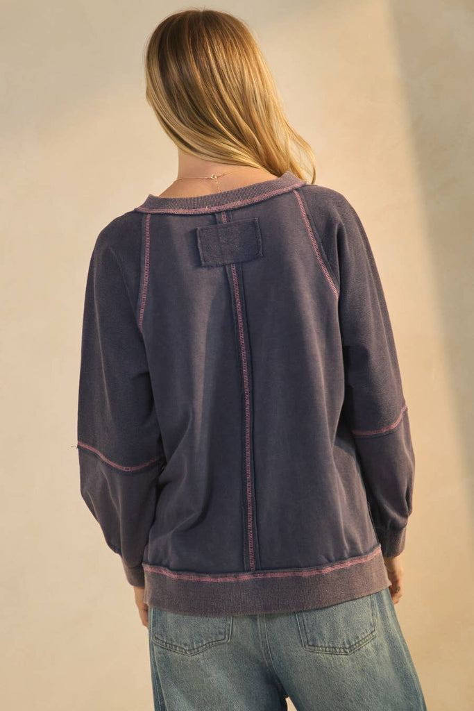 Acid washed long sleeve sweatshirts with contrast stitching details