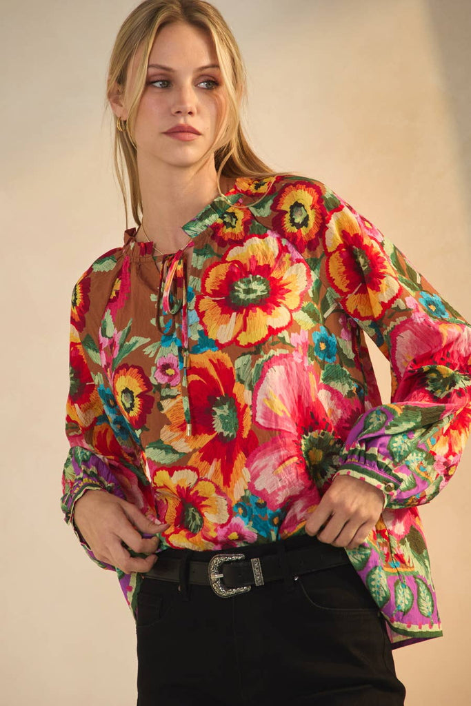 Floral border printed blouse with gathered neckline, keyhole front, and long raglan sleeve. Also available in sizes S to L: Style no. IT18565. Total Length: 24" Content: 83% Rayon, 17% Nylon