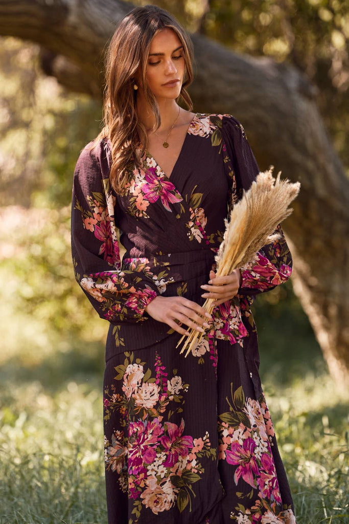 Oddi - Floral Printed Wrapped Midi Dress: Brown Multi / L