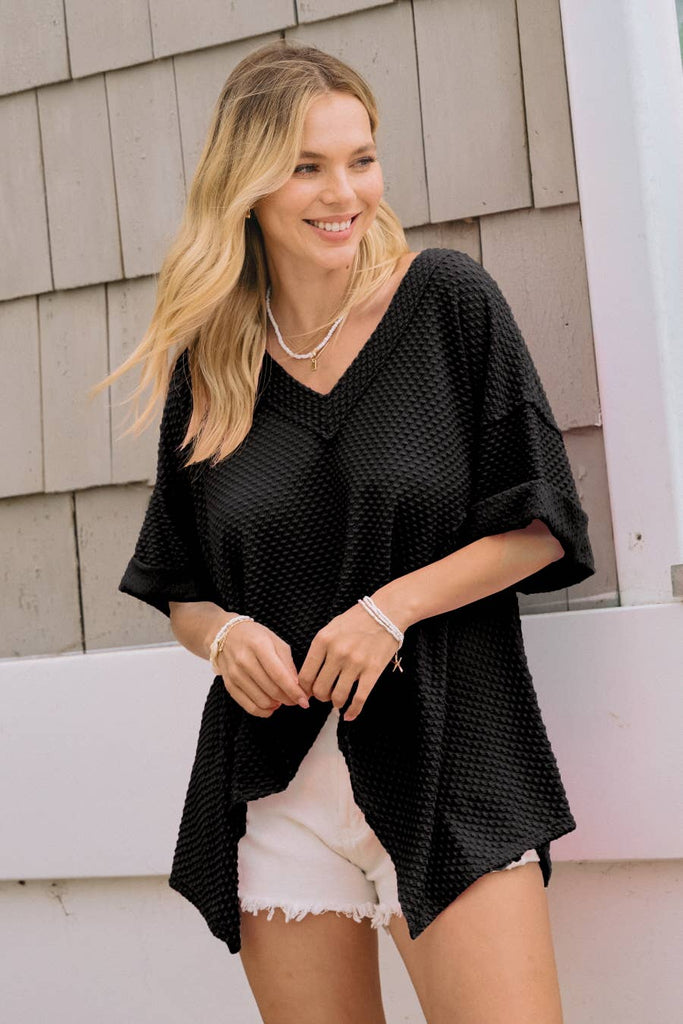 Dotted jacquard knit short sleeve top with seam details. Also available in sizes S to L: Style no. IT17640. Total Length: 26 1/2" Content: 97% Polyester, 3% Spandex