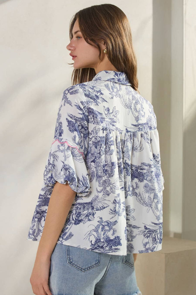 Toi de paris printed blouse with scalloped embo details. Also available in sizes S to L: Style no. IT18068. Total Length: Content: 95% Rayon, 5% Nylon, Lining: 100% Polyester