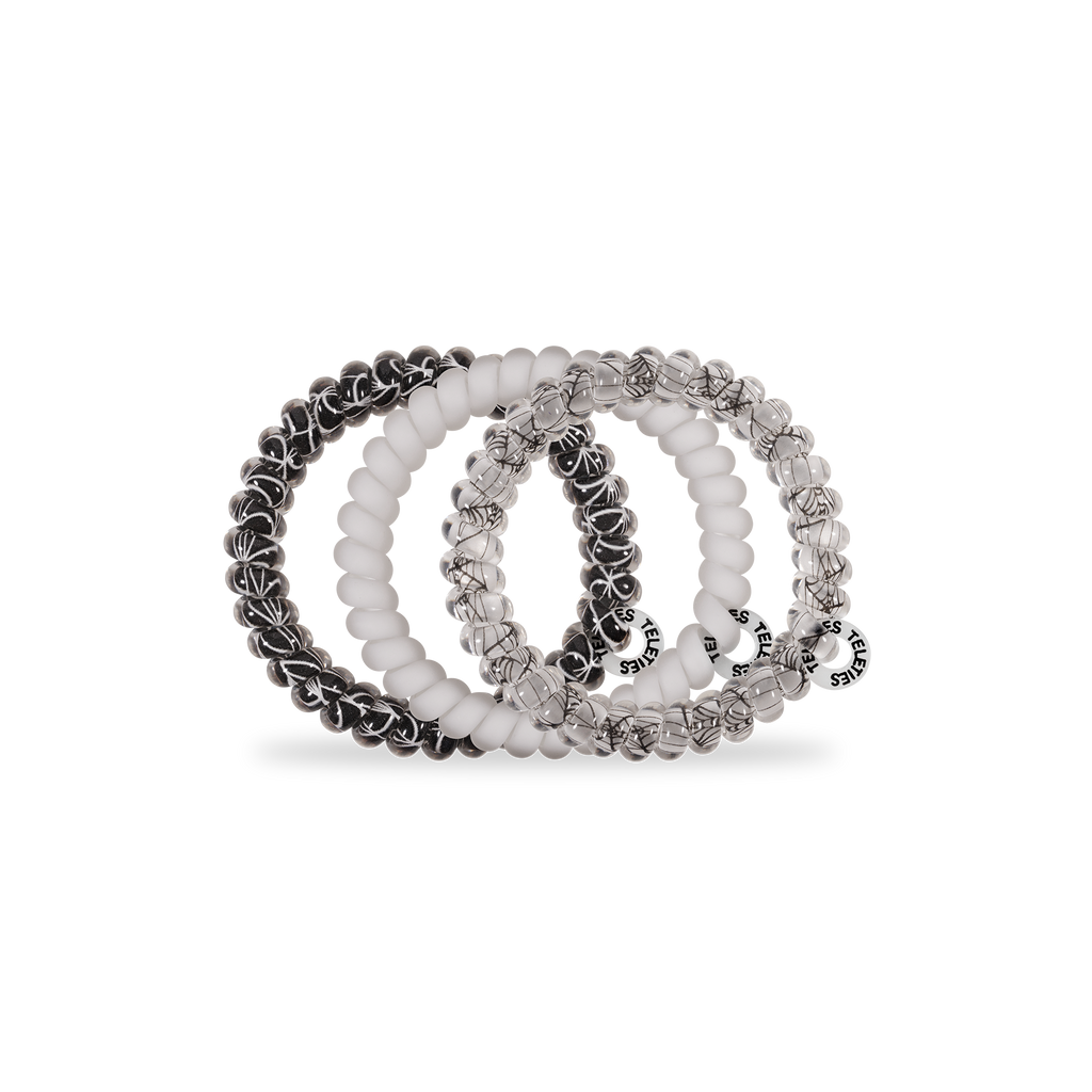 Webbed Small Hair Ties in Black and White offer a strong grip without damage, doubling as a chic wrist accessory when not in use. Your new favorite hair essentials all year round.